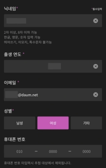 티벗 앱 회원정보에는 닉네임, 성별, 이메일, 출생 연도, 휴대폰 번호를 입력합니다. 특히 휴대폰 번호를 정확하게 입력하셔야 나중에 아침마당 돌발퀴즈에 당첨되었을 때 연락을 받을 수 있습니다.