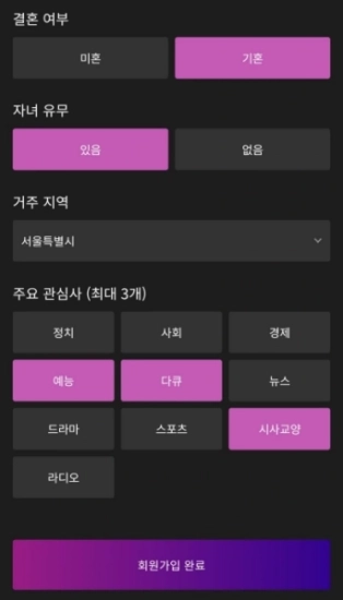 그리고 나서 선택사항인 결혼여부, 자녀유무, 거주 지역, 관심사를 선택하고 [회원가입 완료] 버튼을 누르면 티벗 가입이 완료됩니다.